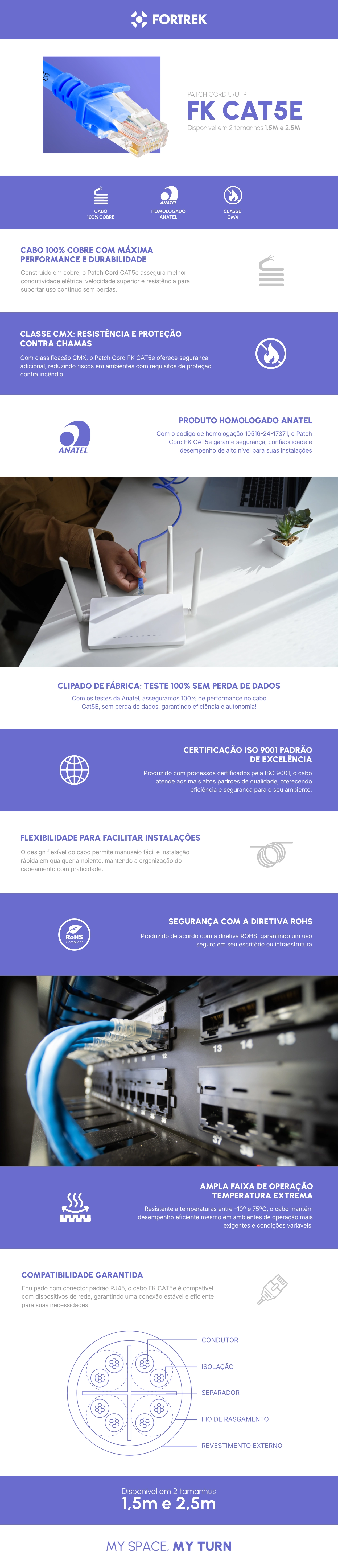 Possuindo conector RJ45 que oferece facilidade de instalação e máxima durabilidade, tornando-o perfeito para ambientes internos que exigem qualidade e segurança na transmissão de dados. Assim, o Cabo de Rede Patch Cord Cat5e da Fortrek é a escolha ideal para quem precisa de um cabo resistente e de alto desempenho para redes de computadores, servidores e outros dispositivos de conectividade. Marca: FORTREK Modelo: FKCAT5E