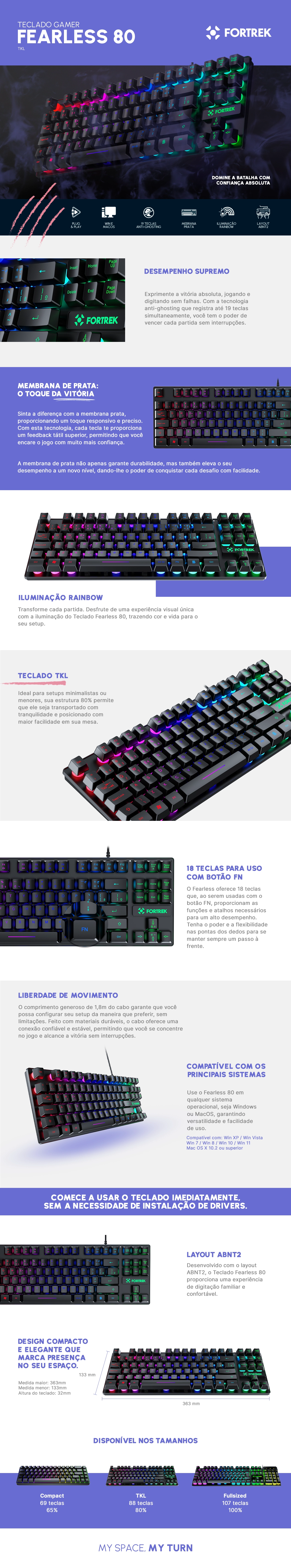 O Teclado Gamer Fortrek Fearless 80 TKL é a escolha ideal para quem busca performance e estilo em um design TKL. Com seu layout ABNT2, este modelo conta com 88 teclas com a precisão e suavidade da membrana, garantindo digitação silenciosa.