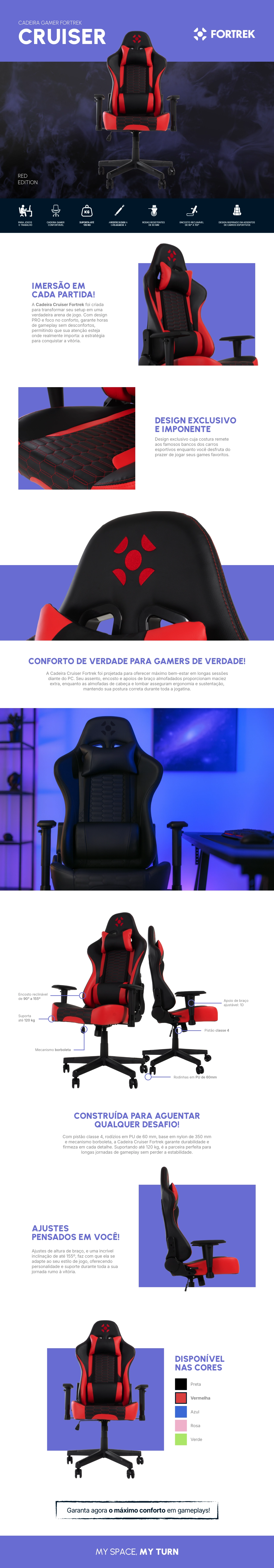 A Cadeira Gamer Fortrek Cruiser possui uma design exclusivo cuja costura remete aos famosos bancos dos carros esportivos enquanto você desfruta do prazer de jogar seus games favoritos. Uma inclinação do encosto de 155º permite que o usuário relaxe após horas de partida ou de trabalho exaustivo, isso unido a um balanço relaxante de 3~18º.